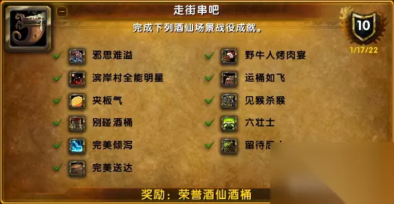 见猴杀猴:这是一个击杀猴岛上精英猴怪的成就,精英猴怪随机刷新(第二阶段),如果这一次场景战役没有刷新,可以重新进入后再次击杀。 邪思难溢:这个成就建议两个玩家去做,进入二阶段后,一个人在大锅面前守着,另外一个人去收集酒桶,不让猴子偷走酒的情况下完成二阶段即可完成成就,把酒从锅里拿出来也不会获得成就。 运桶如飞:进入场景战役后来到酿酒大锅的旁边,击杀第一波猴怪后,找到其他有名字的精英猴怪,将其拉倒大锅边上击杀后,拾取丢入大锅中,如果会脱战就只能击杀小怪拾取酒桶了,由于身上的BUFF超过25层后就无法点击酒桶,建议玩家身上有20层BUFF后再去拾取一个20或者更高层数的酒桶,这样会比较节约时间。 夹板气:到最终阶段时,乌克头领出现,直接击杀即可。 酝酿风暴场景战役中一共有三个成就,分别是完美倾泻、六壮士、别碰酒桶,这三个成就比较好做,下面为成就做法。 完美倾泻:在进入场景战役后,会有雷电击中木棒,并会有范围性的伤害,躲开蓝色光圈,之后点击着火木桶,等待中间的进度条完毕后,即可获得成就,如果被闪电带来的蓝色光圈击中需要重新进入做这个成就。