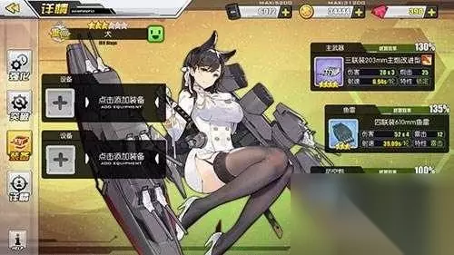 性能:炮击A、耐久A、防空C、机动C、航空E、雷击C 属性:耐久:738、装甲:中型、装填:64、炮击:50、雷击:45、机动:10、防空:3、航空:0、消耗:4 同为高雄级,性能和属性和高雄差别不大,这也是预料之中的。 装备效率