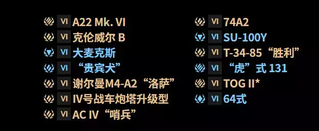 如果从集装箱中掉落了您已经拥有的车辆,您会得到1个VI级幸运集装箱,同样必然掉落列表中的1辆VI级战车: