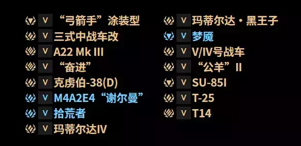 在2019年6月26日至2020年6月25日期间创建账号的车长会收到1个V级幸运集装箱。这个集装箱必然掉落列表中的某一个车辆:
