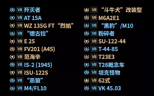 在2018年6月26日至2019年6月25日期间创建账号的车长则会收到1个Ⅶ级幸运集装箱。这个集装箱必然掉落列表中的某一个车辆:
