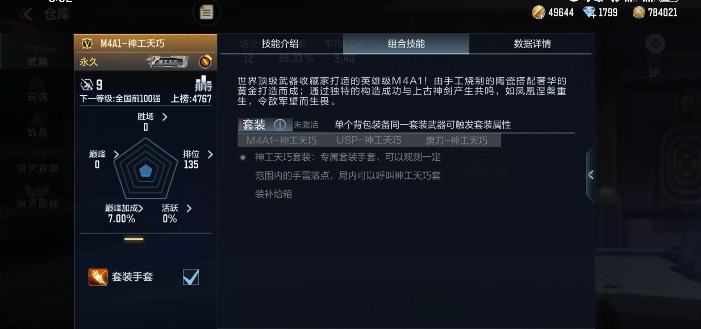 最值得称赞的是套装技能:专属套装手套、可以观测一定范围内的手雷落点,局内可以呼叫神工天巧套装补给箱,这个套装武器也让这把主武器有了“小星象”的美称!