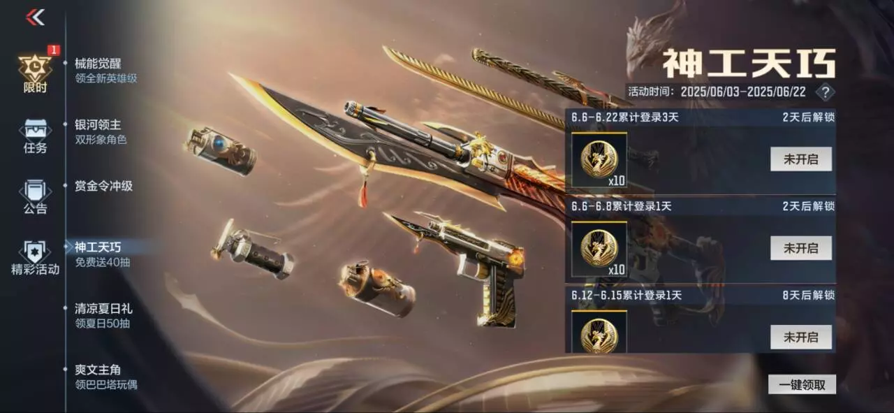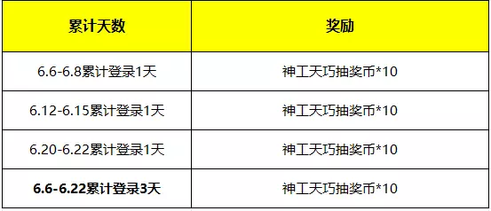活动时间是2025年6月3日到6月22日,在规定时间登录即可领取神工天巧抽奖币,代币可以在活动中参与抽奖,累计登录3周即可领取共计40抽的代币,简直壕破天际!