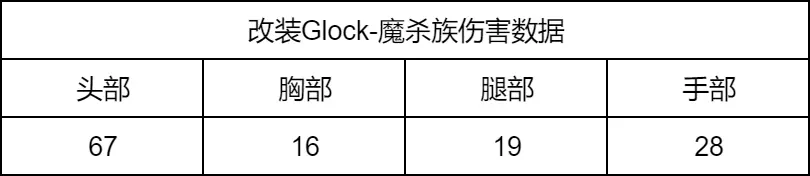 接下来让我们来看一下这款全新枪械的伤害数据,由于改装Glock-魔杀族具有伤害无距离衰减的特性,所以无论是近距离、中距离还是远距离,无论是单发模式还是连发模式,枪械在同一部位的伤害相同,具体数值可以参考以下表格。