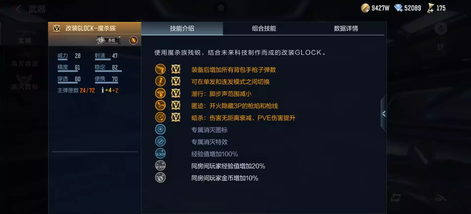 作为一款英雄级副武器,装备后增加背包所有手枪子弹数是必不可少的属性技能。其次,作为改装Glock家族系列的一名新成员,改装Glock-魔杀族也可以在单发和连发模式之间互相切换。此外,改装Glock-魔杀族还拥有潜行、匿迹、暗杀三项专属技能。潜行可以使脚步声范围减小;匿迹可以在开火的时候隐藏3P的枪焰和枪线;暗杀则拥有伤害无距离衰减以及PVE伤害提升的效果。