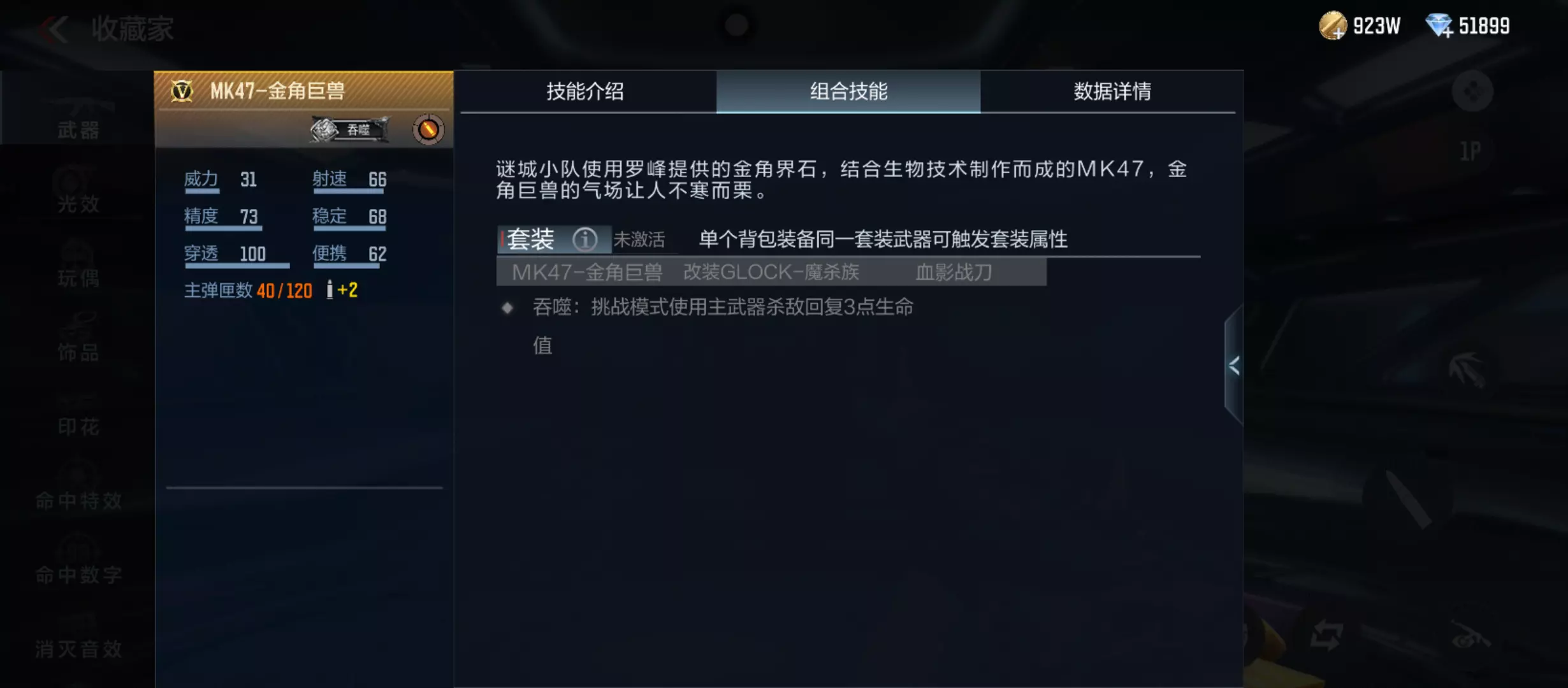 此外,如果单个背包同时装备有MK47-金角巨兽、改装Glock-魔杀族以及血影战刀的时候,则可以激活专属套装属性吞噬:挑战模式使用主武器杀敌回复3点生命值。