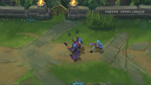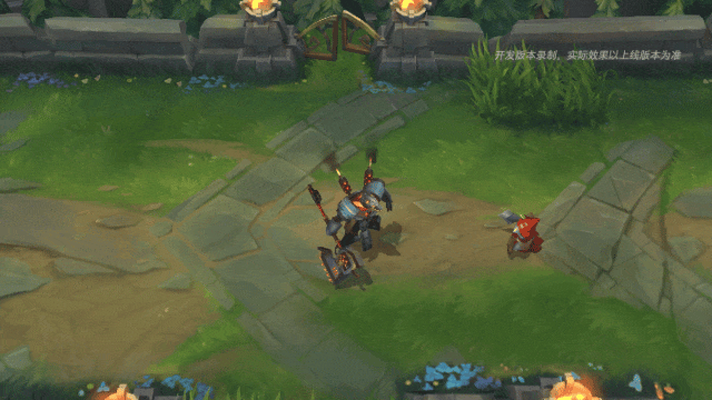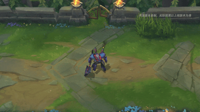 内瑟斯施放一个具有强大魔力的橙红色机械网格阵,其外边由机械“狗头”标志连接而成,此时他的身躯变大,全身将迸发出熊熊烈焰,为自身增加生命值、护甲和魔法抗性。
