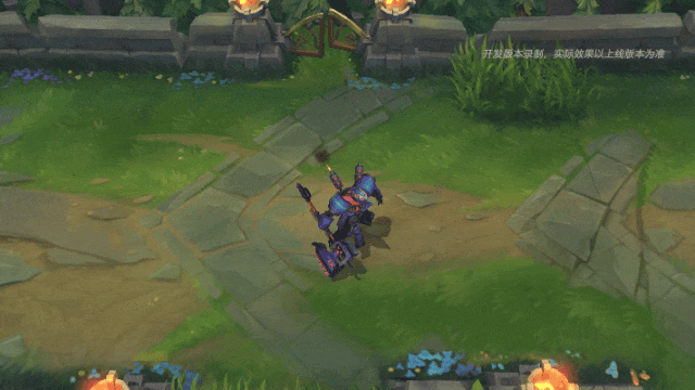 蓝色光圈忽现,“X”刻印扩大消逝,内瑟斯向目标区域召唤出带有机械“狗头”图案标志的火焰法阵,以造成一定魔法伤害。接下来一段时间,还将对区域内的敌人每秒造成魔法伤害,并削弱其护甲。