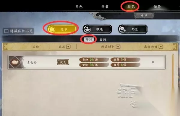 素女丹要在背包里先使用掉,然后才能在“技艺”一栏进行合成。如果你刚才在谷中各处仔细搜刮过,所需材料是够的。