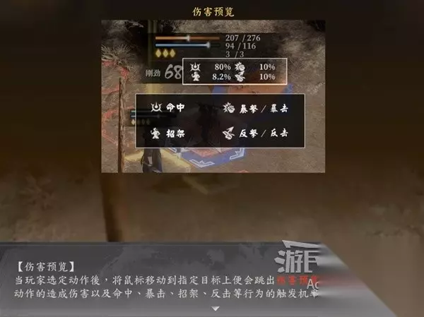 选定招式后,把鼠标移动到目标上,可查看伤害预览。