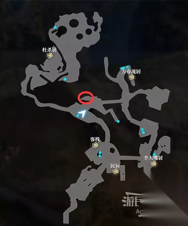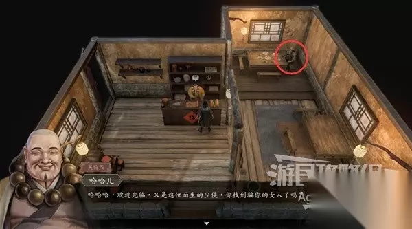 客栈是笑里藏刀哈哈儿开的黑店,进入客栈可以搜刮到物品,客栈对面的民居里也有些物品可以搜刮。 与客栈门前的俩人对话听到传闻,得知小鱼儿的法宝藏在某处。