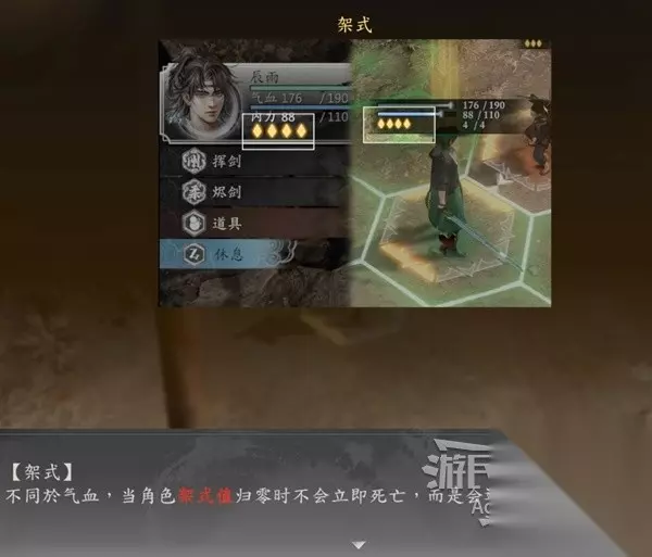 血条和内力条下方的黄色菱形代表架式,架式值归零会陷入虚弱状态。