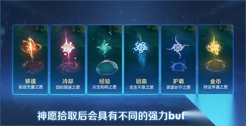 前途无量之愿:立刻获得短暂移速增加,脱战后可重新获得少许 四时顺遂之愿:立刻使技能冷却减少,并加快技能冷却转动速度 众生和鸣之愿:立刻获得大量经验,并持续获得经验加成 生生不息之愿:立刻恢复大量生命,并获得持续生命恢复,脱战后加快 家国长宁之愿:立刻获得真实护盾,脱战后可重新获得少许 财运亨通之愿:立刻获得大量金币,并持续获得金币 【小编推荐】专区入口 || 视频站入口 || 体验服申请入口 || 全民竞猜赢好礼 【新英雄爆料】| 司马懿 || 瑶 || 孙策 || 新英雄:囚徒/书圣/瞬 | 【新皮肤爆料】| 李白团战皮肤:敏锐之力new || 诸葛亮团战皮肤:掌控 || 典韦穷奇皮肤 Hot!! | 王者荣耀最新攻略 赛季段位继承表 每日一题 边境突围玩法攻略 体验服爆料
