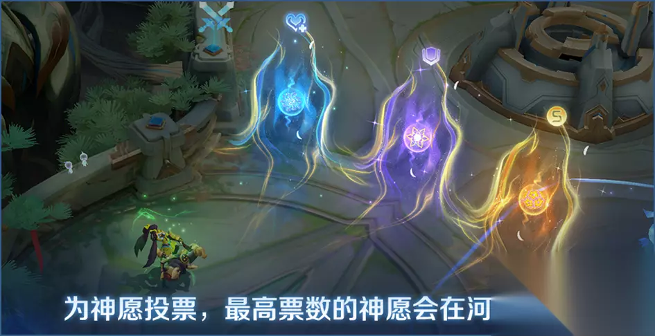 开放时间:1.23更新后~2.12 神愿投票: 开局会随机3种神愿,双方通过碰撞对应神愿区域进行投票,票数最高的神愿对应的心愿之神会降临峡谷,投放神愿