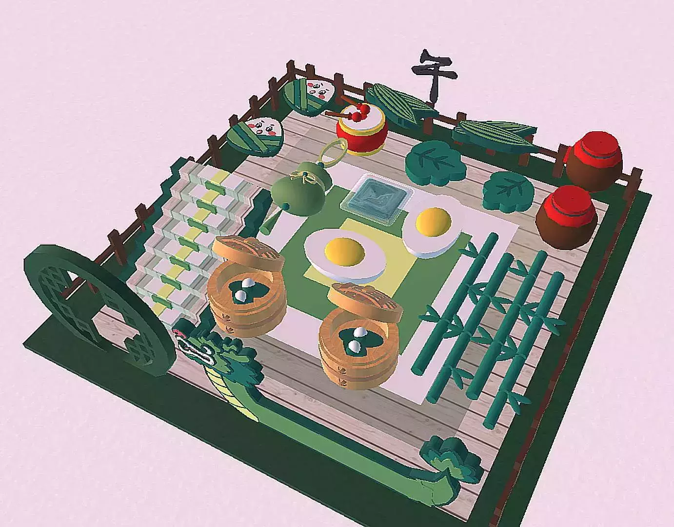 ⭕元素➕主要🈶 🛶龙舟🐉 荷花 粽子🍙 香囊 艾叶🍃咸鸭蛋🥚 龙舟鼓🥁 雄黄酒 粽叶🍃 竹子🎋 左上角还只做了一个竹林🎋小水池💦 跑酷背景的山⛰️是借鉴了令老师的 还有用圆柱和方块拼的“端午”两字 简直就是如虎添翼!୧꒰•̀ᴗ•́꒱୨