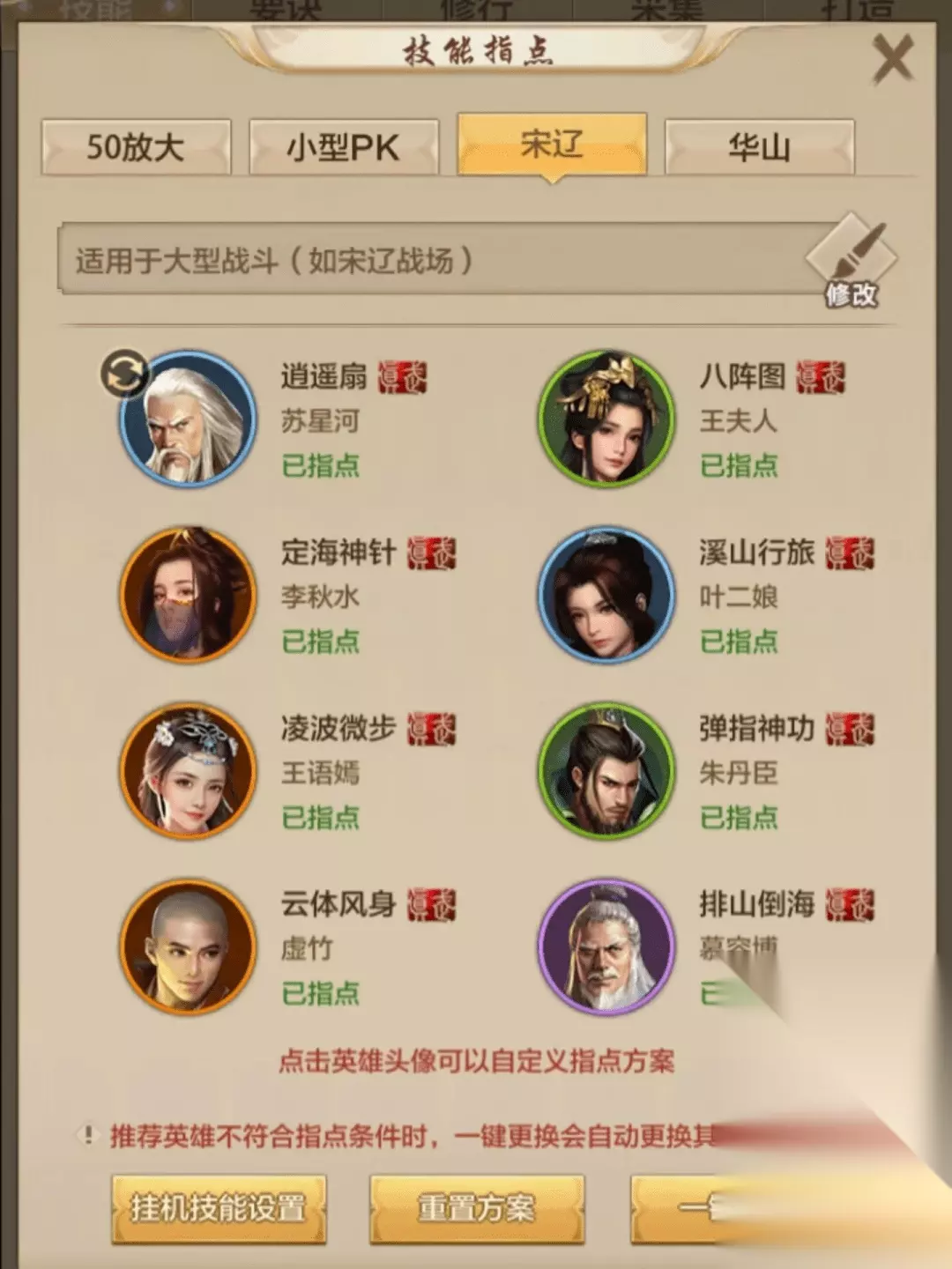 2.小型PK 这套指点用于单挑对战,真武无崖子溪山行旅给自己门派增伤放大100%配合真武虚竹云体风身提高50%伤害,把握好时机伤害爆炸。实战中需要注意的是溪山行旅和云体风身是核心爆发的基础,不能随意使用。当敌人的宝宝死掉或用了神佑、破了自赏等保命能力后再用,起手云体风身(驱散)接溪山行旅接排山倒海接弹指神功接排山倒海接八阵图接排山倒海中间穿插逍遥扇,灵活运用凌波微步追击或逃跑,溪山行旅放大也是会未击中的云体风身也可以换成萧远山指点防身,凌波微步换成段延庆指点减伤,慕容复逍遥扇可以换宗派慕容复寒袖拂穴-爆发 3.宋辽 这套指点把乔峰移除冷却时间的单体排山倒海换成了慕容博15秒冷却的群体排山倒海,建议手动使用,定海神针找准人多的地方用,配合八阵图,云体风身,排山倒海。注意使用时机,遇到慕容反伤、自赏、不屈、呆几、神佑者,切换目标别浪费技能,尽量打在人多的地方。不要仇敌,这套技能单体伤害不高,龙纹最好带电跃,暗器技能带耀武,凌波微步用于往后拉,不要用错方向到人群中了