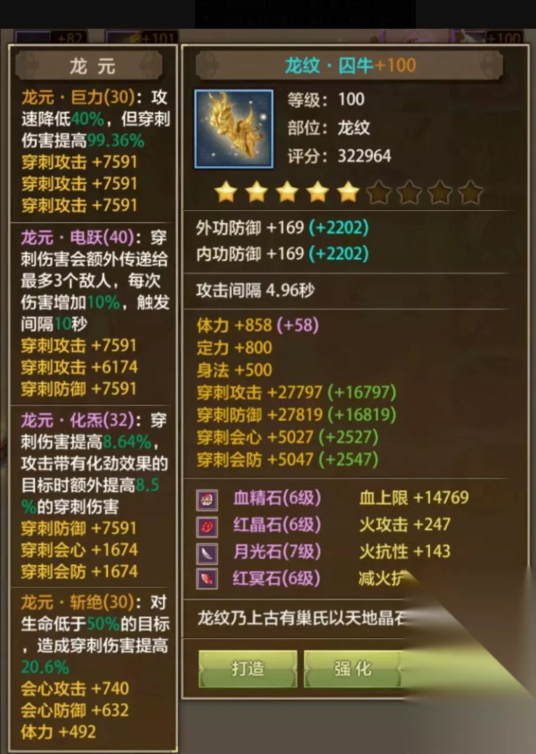 龙纹推荐: 主龙元:巨力+化炁/舍身+电跃+斩绝/神钦 辅龙元:神钦(穿刺攻击)+掠夺(穿刺攻击)+电跃(穿刺攻击)+鬼伏(穿刺攻击)+穿云(穿刺攻击)+连破(穿刺防御)+回转(穿刺防御)+舍身(穿刺防御)+化劲(穿刺防御)+无相(穿刺会心)+固守(穿刺会心)+禹步(穿刺会防)
