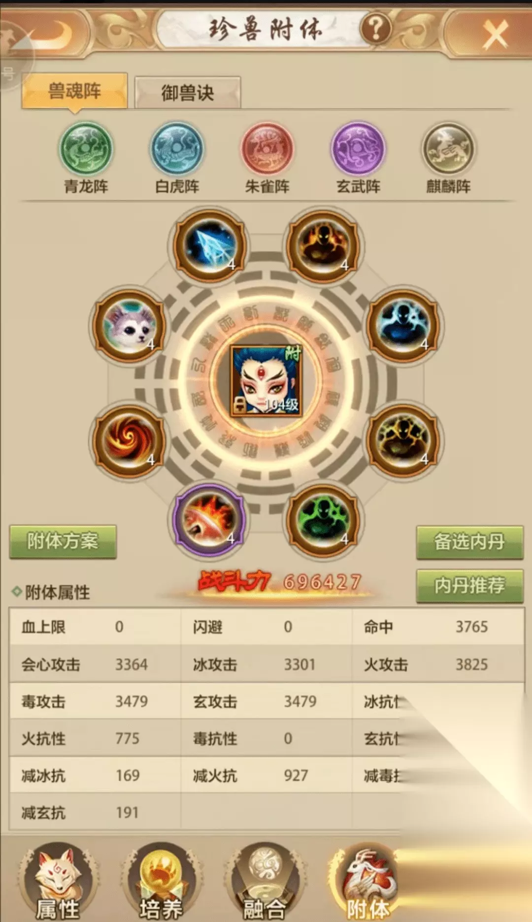 附体选内攻型宝宝 双修内丹:火攻、火抗/其他抗、减火抗、命中、闪避、会心、沸血、毒攻 三修内丹:火攻、火抗/其他抗、减火抗、副属性、副属性、命中、会心、副减抗 四修内丹:冰火玄毒属性内丹、火抗/其他抗、会心、火减抗、副减抗(青龙阵冰减,白虎毒减,朱雀玄减,玄武命中、麒麟命中)