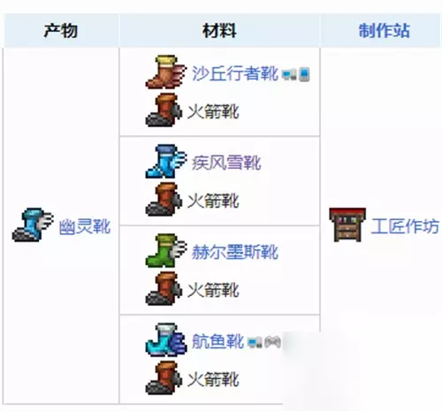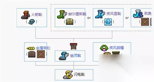 疾风雪靴:在雪地钓鱼的冰冻匣和雪地地下的冰冻箱找到 火箭靴:从哥布林工匠处用5金币购买 沙丘行者靴:可以在地下沙漠的沙岩宝箱中找到 赫尔墨斯靴:在地下、地下沙漠、和地下丛林的宝箱中找到 航鱼靴:通过钓鱼获得的木匣或者铁匣开出 6、闪电靴