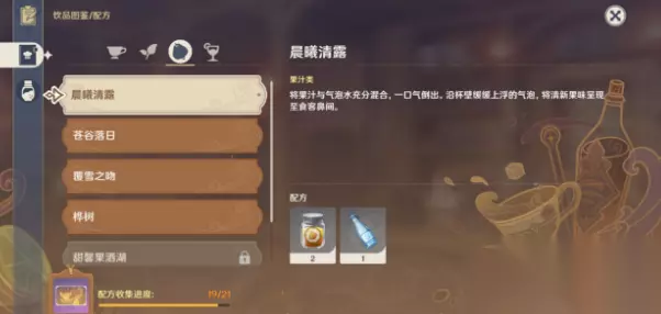 t15_2-t15_1:7.0 在原神游戏中最近开启曲生酌微梦的调制饮品的活动,其中晨曦清露是果汁类型的饮品,口感清新,喝完满嘴都是水果的清香,有玩家还不知道配方是什么,接下来小编为大家带来了详细介绍,希望可以帮助到大家。