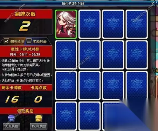 魔性卡牌对对翻活动在活动图标那里,奖励是重新装备,玩家们如果能通关推荐图的话,就会有两次翻牌的次数了!