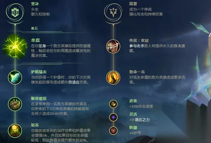 基石符文及出装思路 有大招在手的蔚作为一个完美的先手开团英雄,先手进场之后常常面临被集火致死的危险,因此符文方面傲物推荐带余震,大招进场触发余震后获得的高额双抗对面是一时无法集火死的,而且还能造成一定的AOE伤害。主系坚决确认了,副系推荐精密,因为蔚的W技能三环伤害在游戏中后期是很客观的,攻速自然越快越好,那么欢欣的作用就体现出来了,相应的符文碎片里还要点出10%的攻击速度,下面是具体的基石符文:
