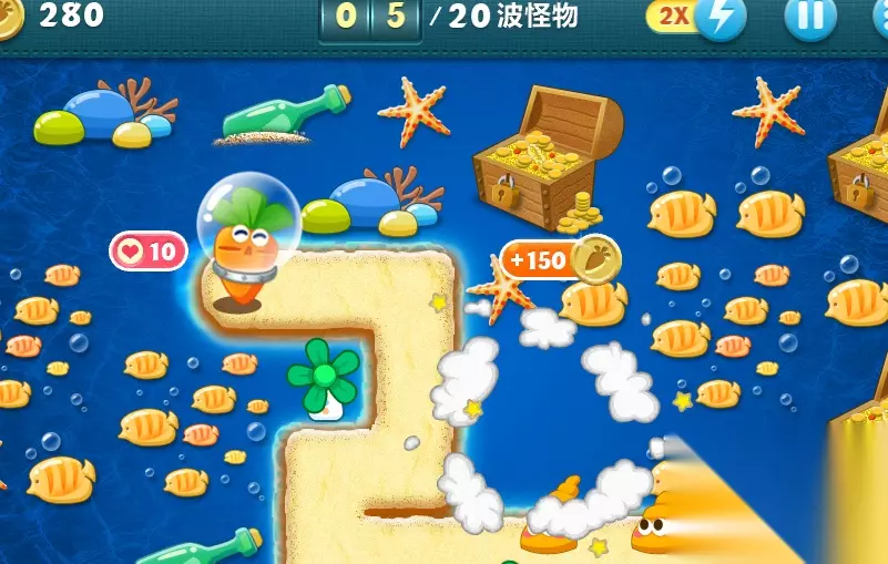 保卫萝卜系列每个关卡都有多种主题,而深海主题的关卡大多数都有一定的难度,所以有部分玩家会因为过不去而卡在这里。就拿深海第五关来说,该关卡所提供的可用塔防很有限,想要完美过关还需要满足几个条件,玩家会因为无法完美过关而错过关卡奖励。实际上,本关卡的主力是鱼雷,它的杀伤力很高,同时还具有强大的穿透能力,所以玩家可多布置些鱼雷击杀怪物。