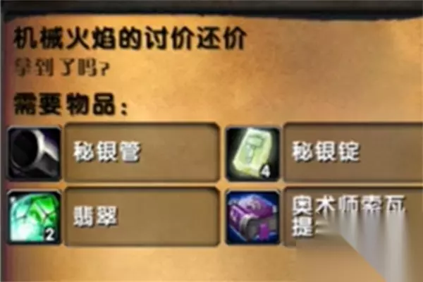 5、在地标(58,69)处找到金色精灵并交还任务。接着接取旁边的小地精的任务,机械火焰的讨价还价。将所需的三种材料交给小地精即可完成任务。