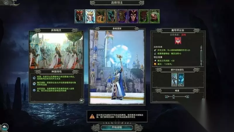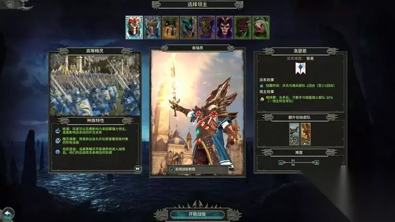 笔者还会在后续攻略中进行技巧和关键内容的说明补充。 «12345678910»友情提示:支持键盘左右键"←""→"翻页 二、战役派系及领主解析 1、高等精灵 高等精灵可以通过花费影响力招募领主和进行外交。 高等精灵在贸易时可以查看对象的所有设施。 战斗中,满员的高等精灵战士可以造成更多的近战伤害。 泰瑞昂领主(战役难度很低) 适合新手,进行单纯的经营、出兵、战斗模式。 对策略要求不高,能够快速上手。 派系效果: ①、减少步兵和骑兵部队招募时间1回合。 领主效果: ①、长矛兵、弓箭手和银盔骑士维持费用减少35%。