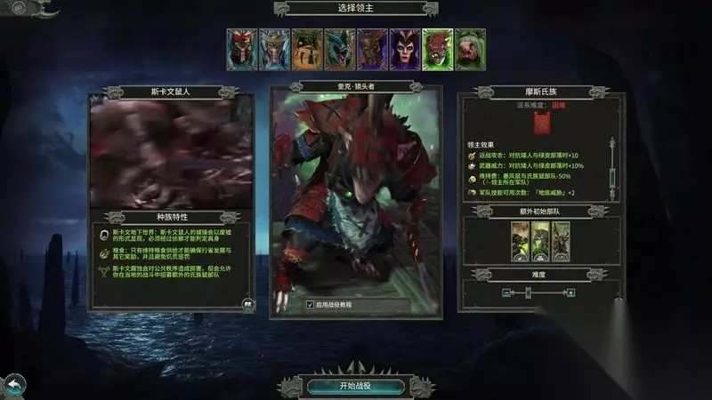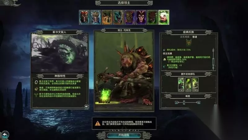 司库克领主(战役难度一般) 以瘟疫单位为主的战争型领主。鼠人普遍不适合稳固慢速的战役打法。 通过腐蚀作用进行大量部队的招募。 需要关注腐蚀和秩序进行战役规划。 派系效果: ①、病原(瘟疫)类建筑的花费减半。 ②、致死计划的成本-75%。 领主效果: ①、病原类(瘟疫)单位的维持费用减半。 ②、斯卡文腐蚀+3。