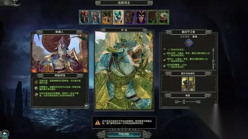 库・迦领主(战役难度一般) 战争型领主,适合进行征服作战。 在使用蜥蜴人特殊的龙类部队时非常有效,后期战力强大。 派系效果: ①、所有部队的维持费用-10%。 领主效果: ①、领主所在部队领导力+10。 ②、蜥人与冷蜥部队维持费用-50%。 ③、增加20点三角龙、甲龙、翼龙和暴龙部队的护甲。 ④、增加上述龙类部队领导力10点。 ⑤、伏击成功率+25%。