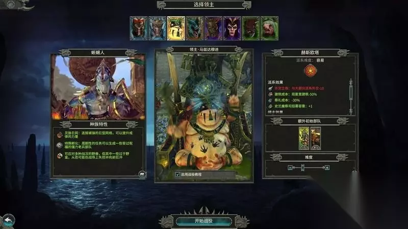 «12345678910»友情提示:支持键盘左右键"←""→"翻页 2、蜥蜴人 蜥蜴人在己方领土拥有更强的作战能力。 完成周期性的任务可以获得受到特殊祝福的强力老兵部队。 蜥蜴人拥有大量野兽部队,作战能力很强,但是可能难于控制。 马兹达穆迪领主(战役难度低) 专注蜥蜴人本身的派系特质的英雄。 可以将蜥蜴人特殊的兵种、建筑发挥出更大的功效。 派系效果: ①、与其它派系外交-10。 ②、观星室建筑费用减半。 ③、祭礼成本-30%。 ④、史兰魔祭司招募容量+1。 领主效果: ①、神殿守卫部队的维持费用-50%。