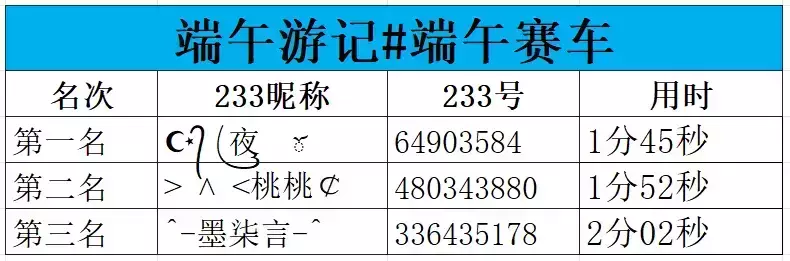 第一期(6.6-6.11)赛车地图【端午游记#端午赛车】竞速活动获奖名单如下: