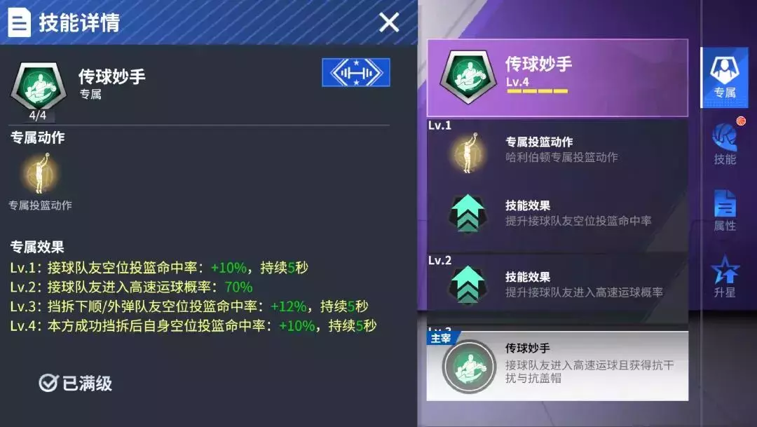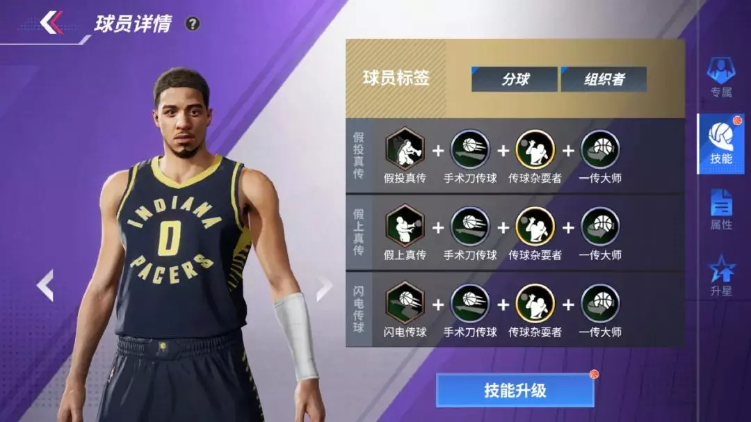 哈利伯顿专属传球妙手,一级解锁专属投篮动作的同时,还可增加接球队友空位投篮命中率,看似自己出手,实则助攻队友,伪装这一块还要看我印城魔术师;二级增加接球队友高速运球概率,你被强化了,还不快上!三级增加挡拆下顺/外弹队友的空位投篮命中率,普通操作你都跟不上,我融入战术你不炸了吗;四级增加本方挡拆成功后自身空位投篮命中率,传了半天球,自己打一颗也很合理吧!