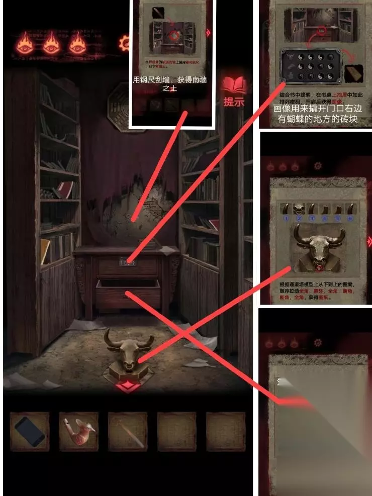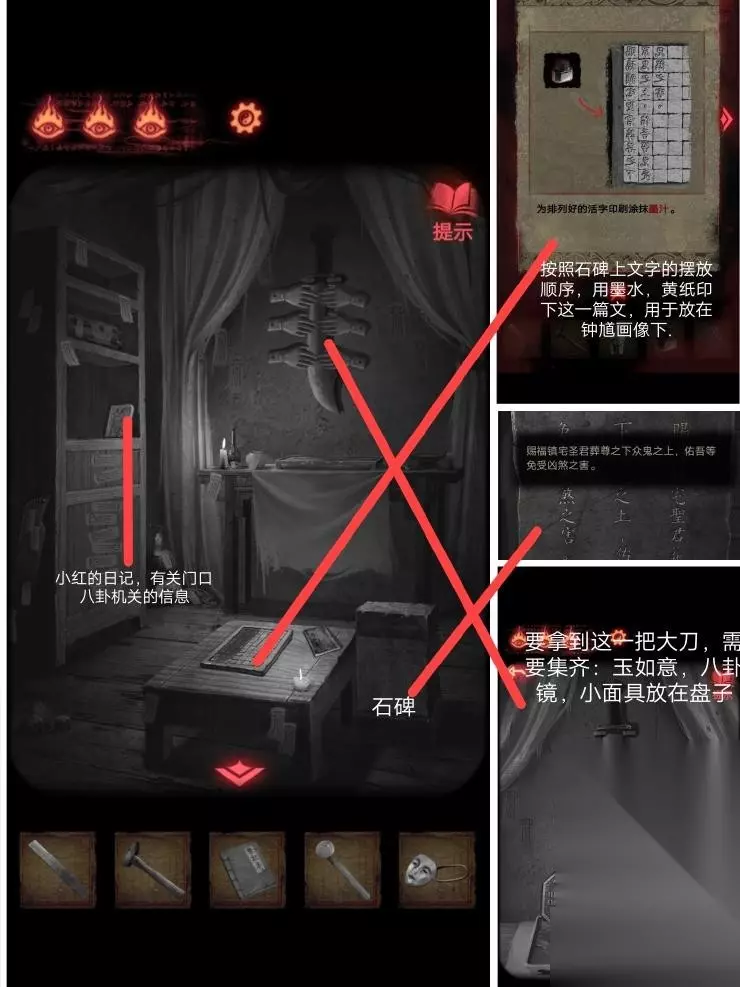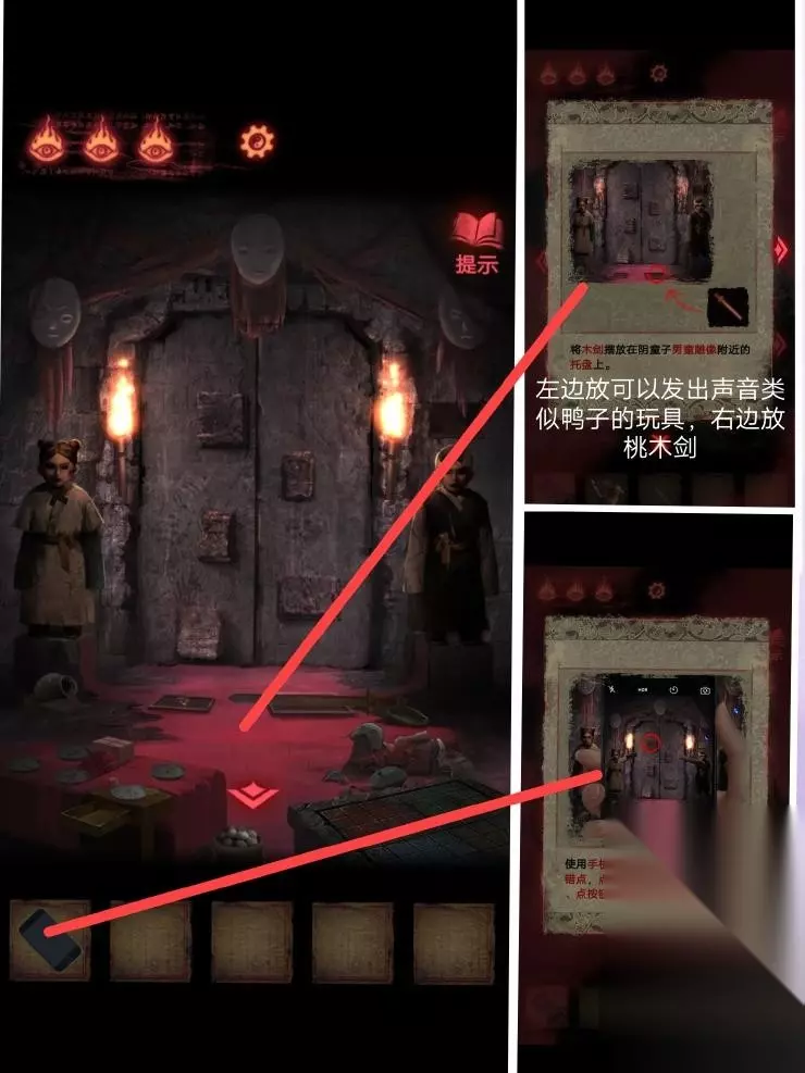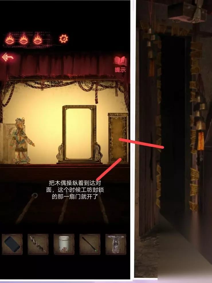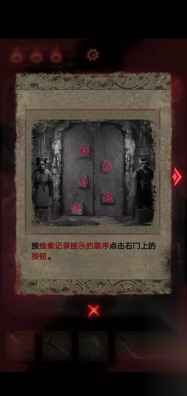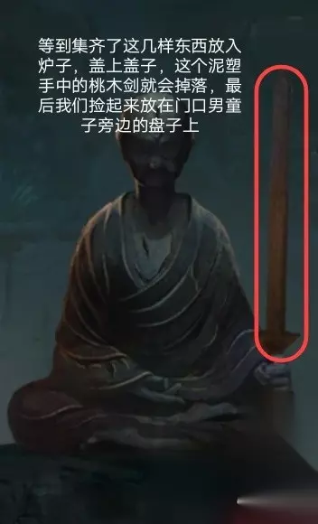 7、这个时候拿到墙上那一柄大刀后,这个地方就会坍塌.拿着刀砍掉戏台上的木偶,便会得到一个奇怪的符号,这个时候退回到门口.梁少平说关门的机关在童子的眼睛上,关门后按照这个顺序点击按钮;