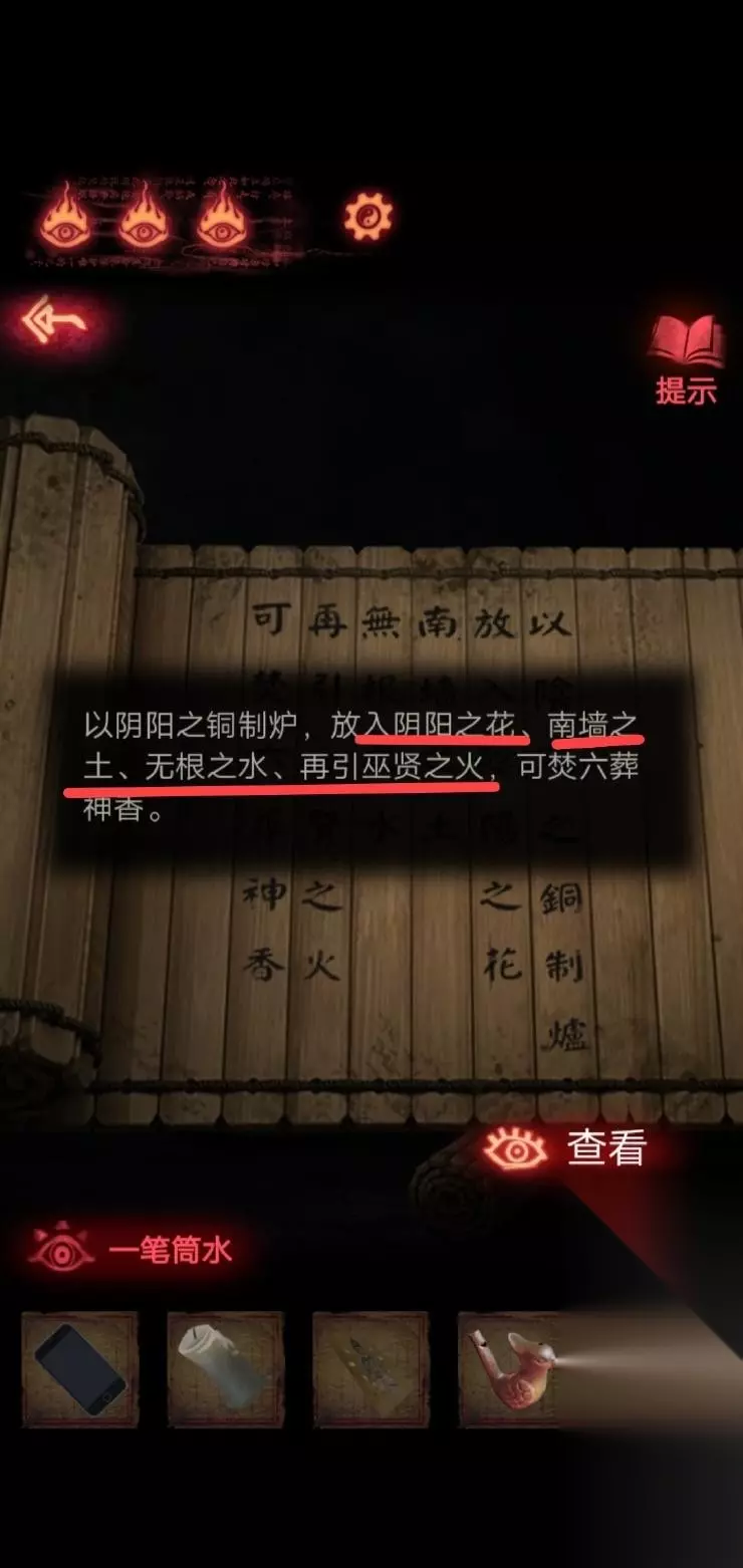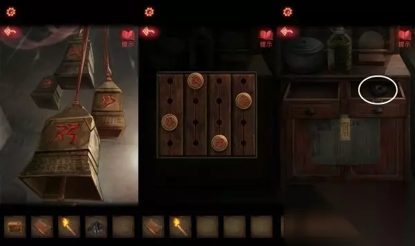 8、根据日记本上面提示,密码:大凶、小凶、大凶、大凶、中凶,打开锁拿到钥匙,钥匙打开门,拿到一个煤油灯。