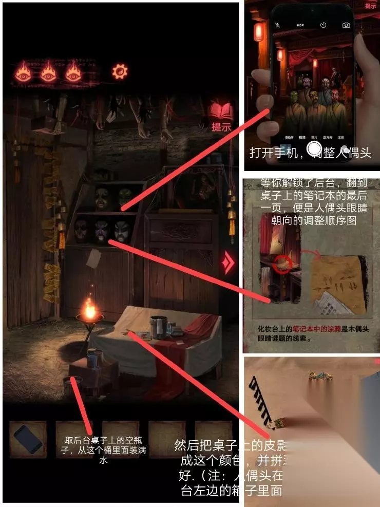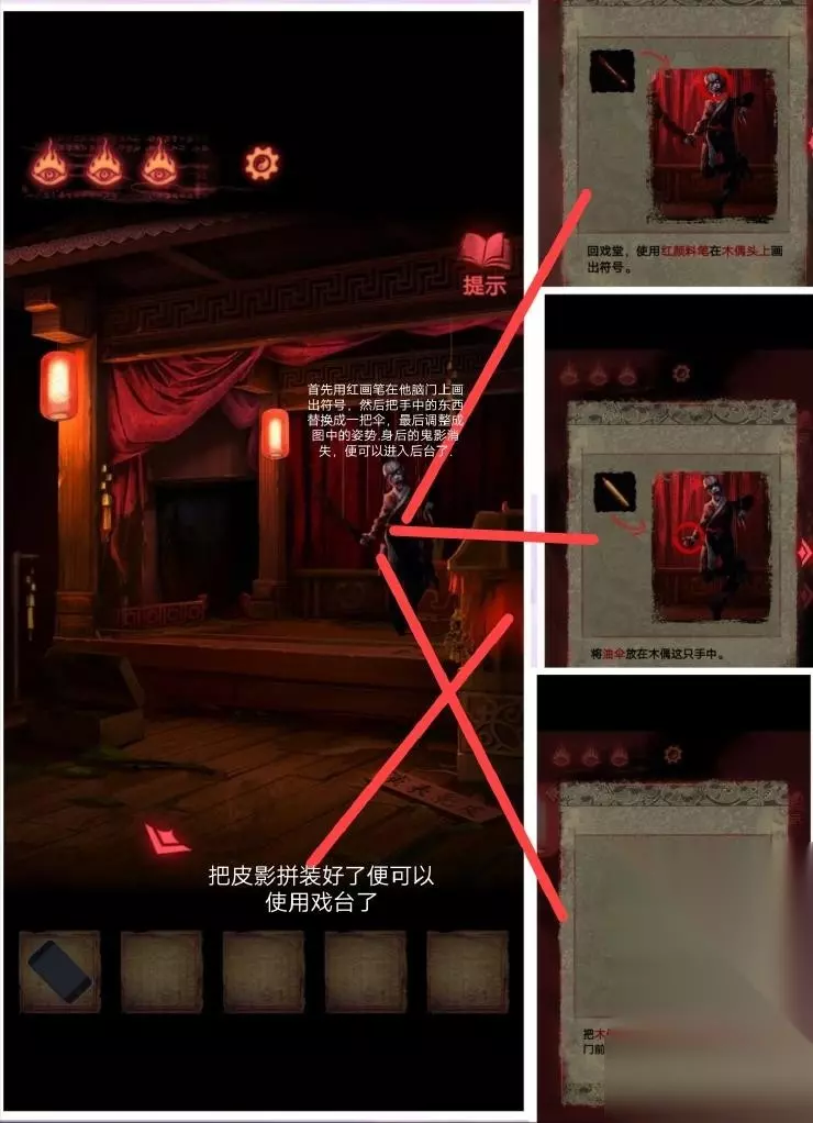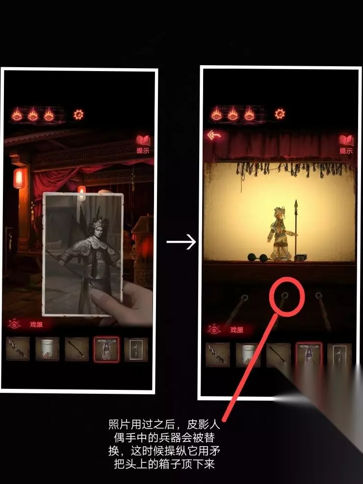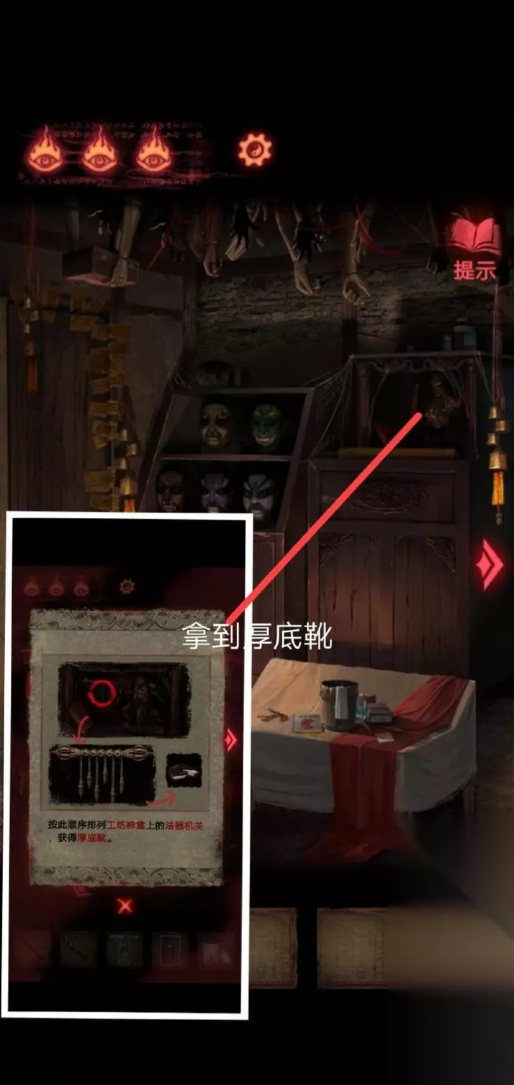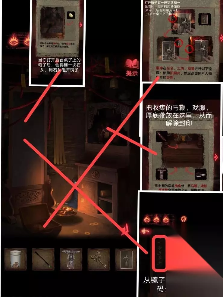 8、然后按照这个密码拿到厚底靴,按照图四:把靴子,马鞭,戏服放在那个位置,解除封印.皮影人偶便可以活动了