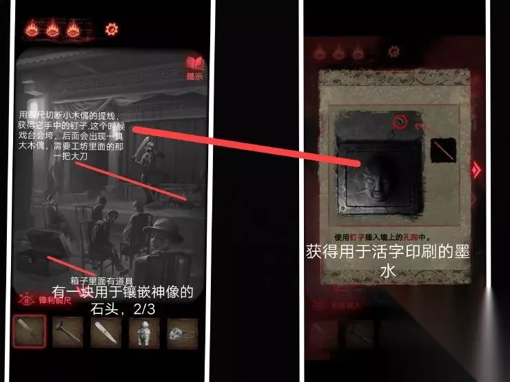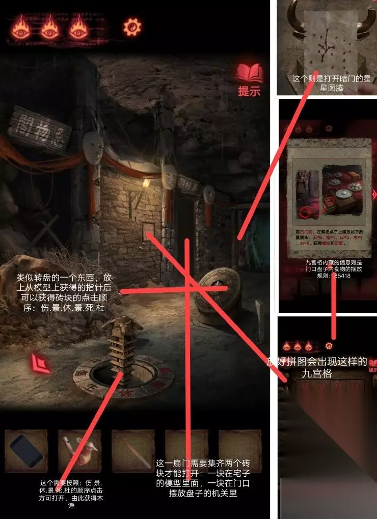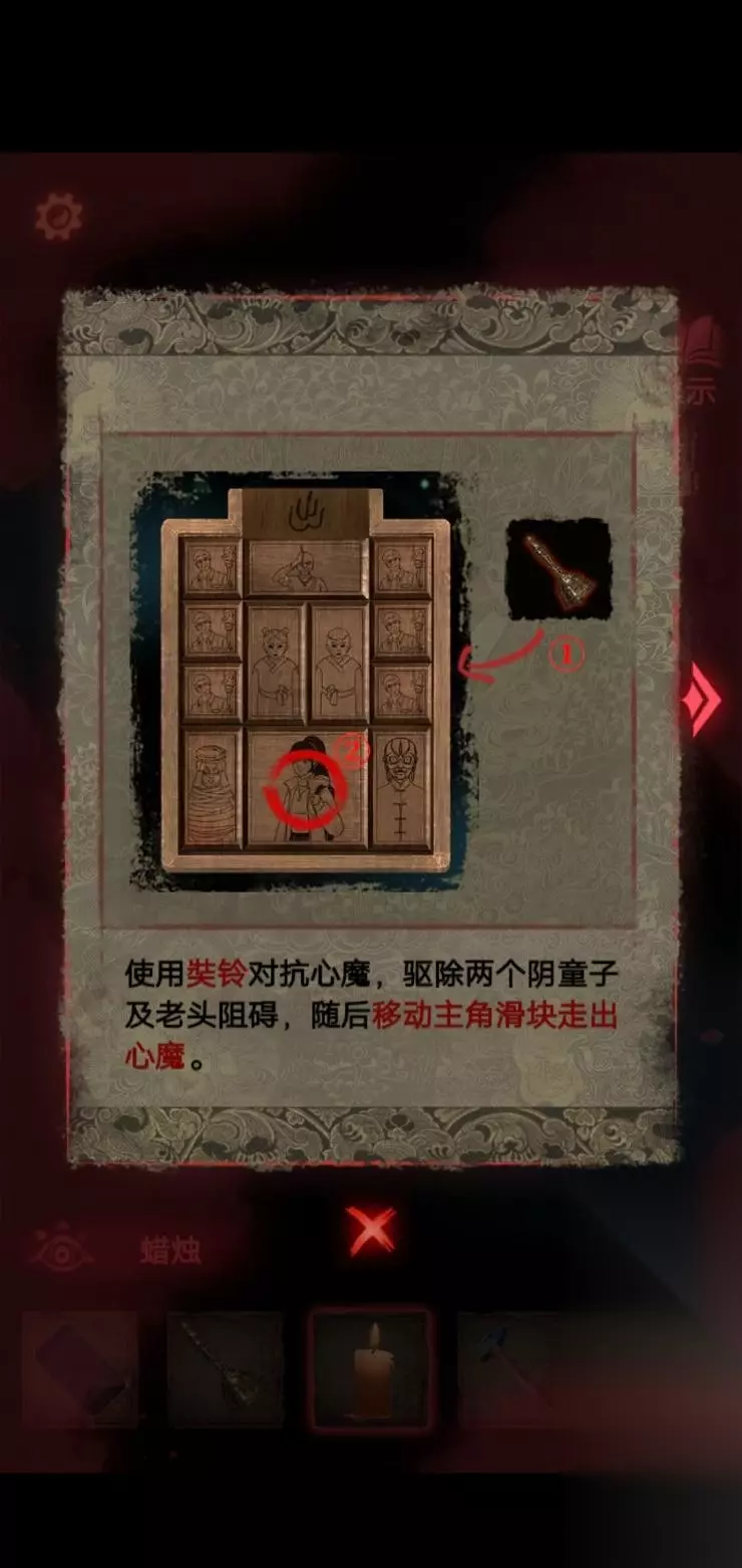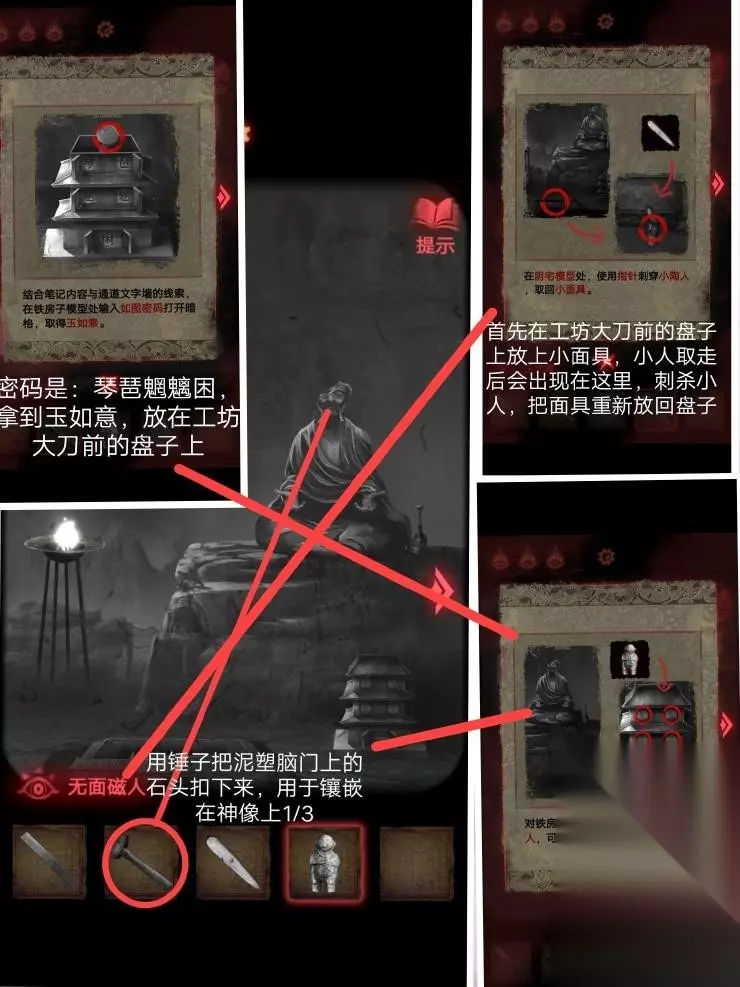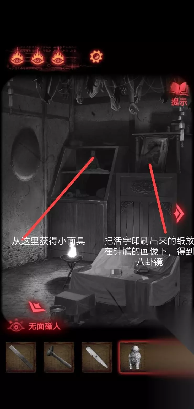 在封煞殿按照正确顺序点燃蜡烛,放上玉石后从神龛里面的夹层取得锤子.