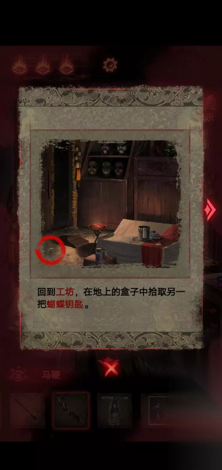 7、箱子里面装着钥匙,这个时候我们回到工坊,钥匙掉下来了,可以打开后台桌子上的箱子.拿到石头砸碎镜子;