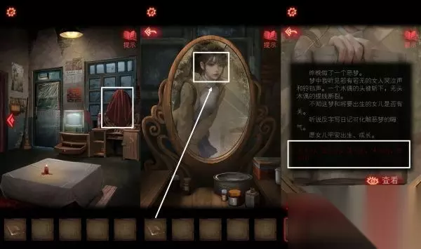 7、镜子上面的红布拿掉,用镜子反射日记本,得到线索。