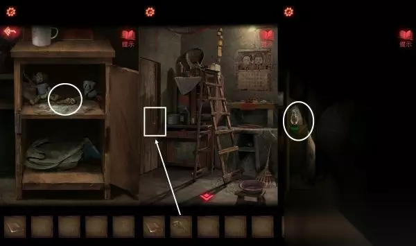 9、煤油灯把桌子上的蜡烛点燃,进入房间之后,根据日记本提示,调整架子上面的物品,会得到【唱片】,架子上有【铅笔】,日记本后面【半张照片】。