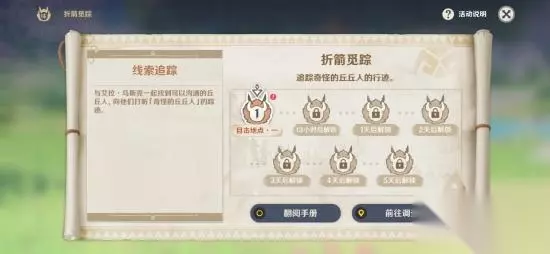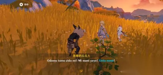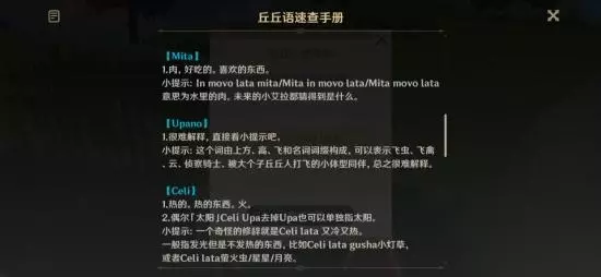 3、完成后来到归离原找到第二个丘丘人,这个比较简单,帮他消灭一群盗宝团就可以了,得到奇怪丘丘人的线索; 4、这里的任务关键词是“Unta nunu",翻阅手册得到这是一个时间,代表深夜;