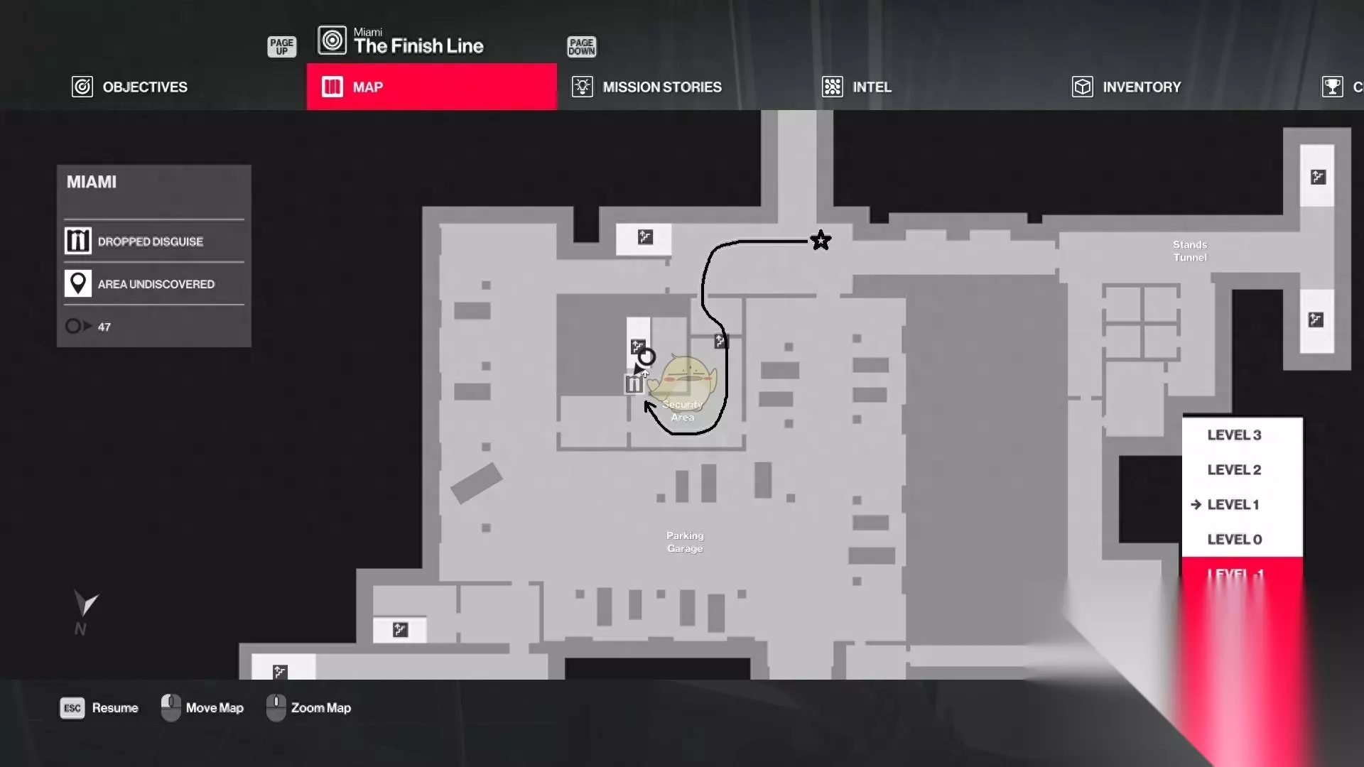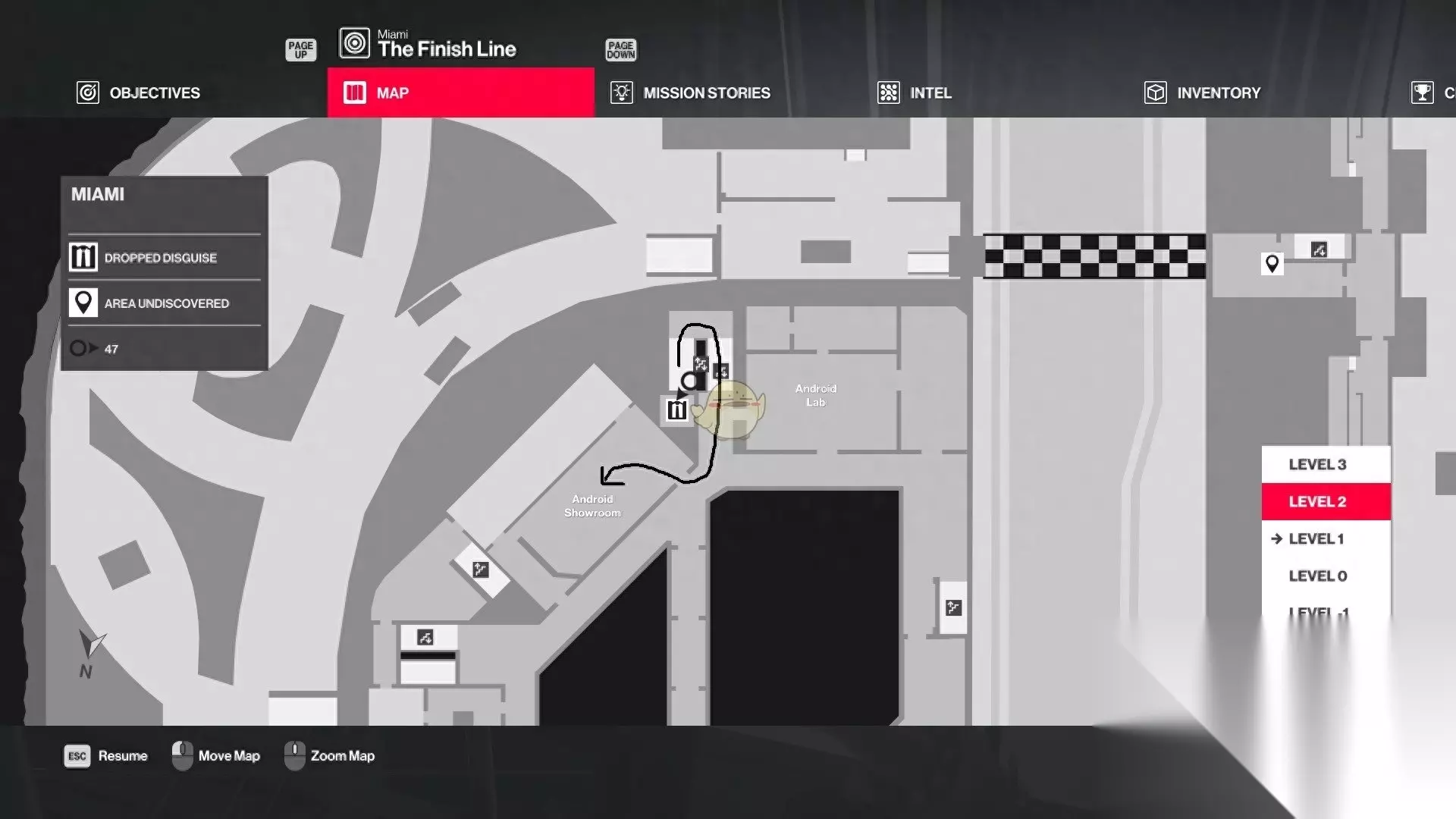 击晕任务故事Pretty in Pink中的身穿火烈鸟衣服的勒索者(就在保安室外头,下左图星标处),并通过下图标识的线路从保安室内的楼梯将其运上二楼。