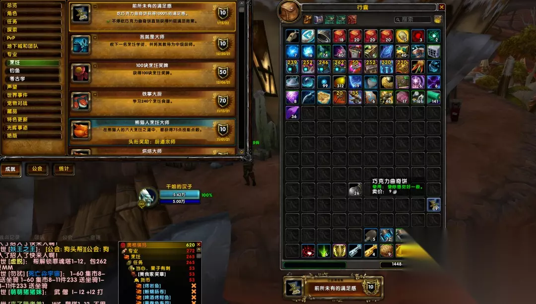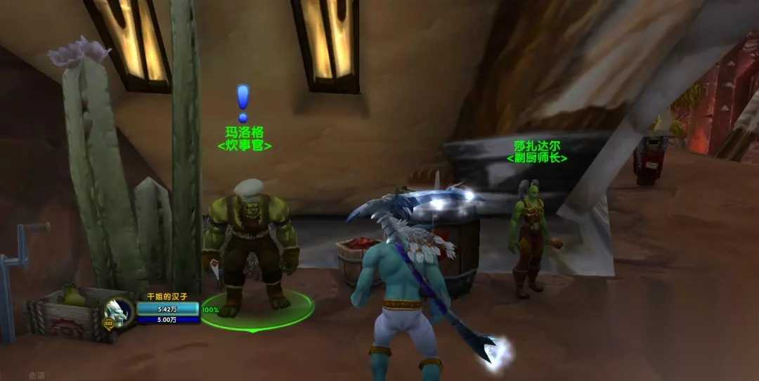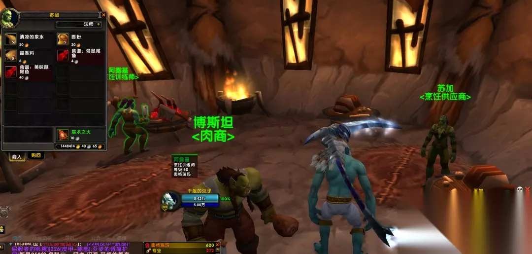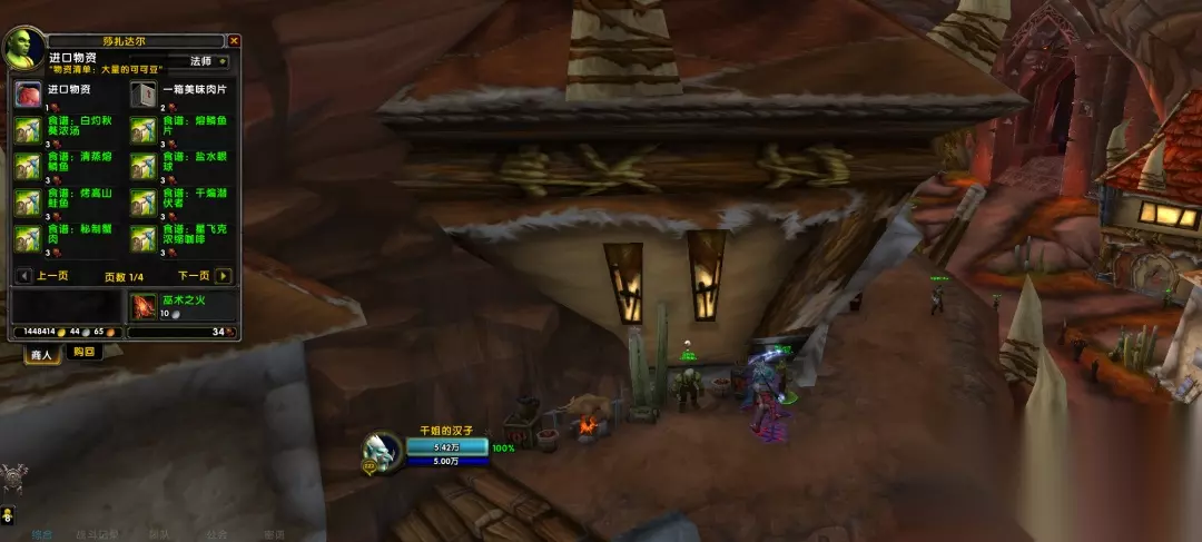 至此,我们买入的道具就集齐了 ,一共也就花了不到20G币 如果大家没有烹饪牌子兑换可可豆和烹饪图纸的话,需要做一下旁边NPC这里一个男兽人的日常任务,1分钟搞定,如图所示: