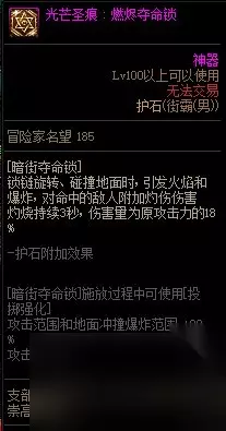 【护石提升率】 伤害提升率32% 【护石解析】 燃烬夺命锁部分重做,相当于给了一个18%占比的3秒灼烧伤害,范围非常大,但纯爆发向因为灼烧伤害的原因相性不佳,持续也没有太多亮点,不建议作为优先护石考虑。