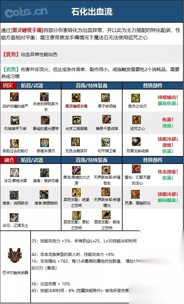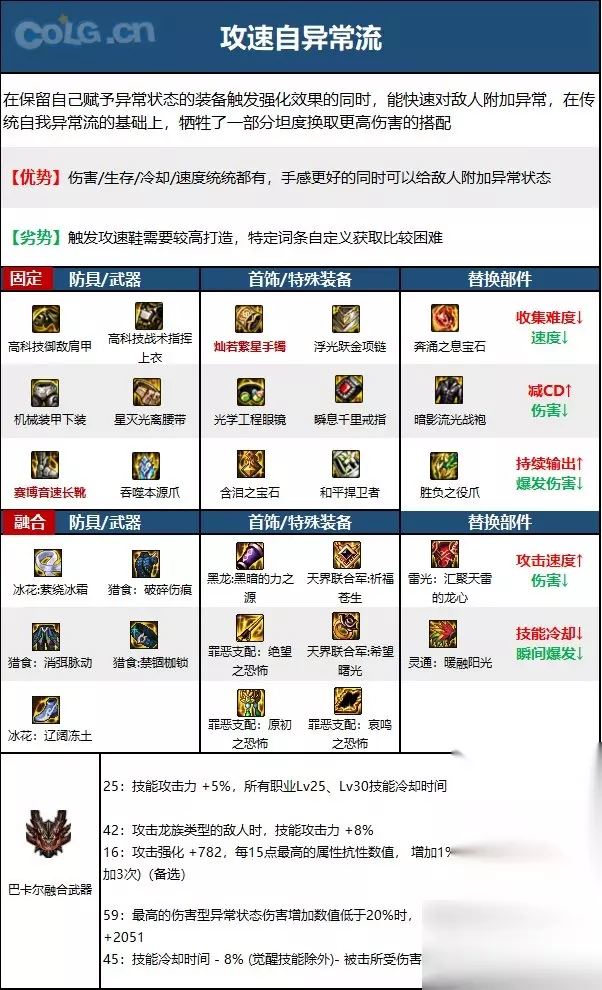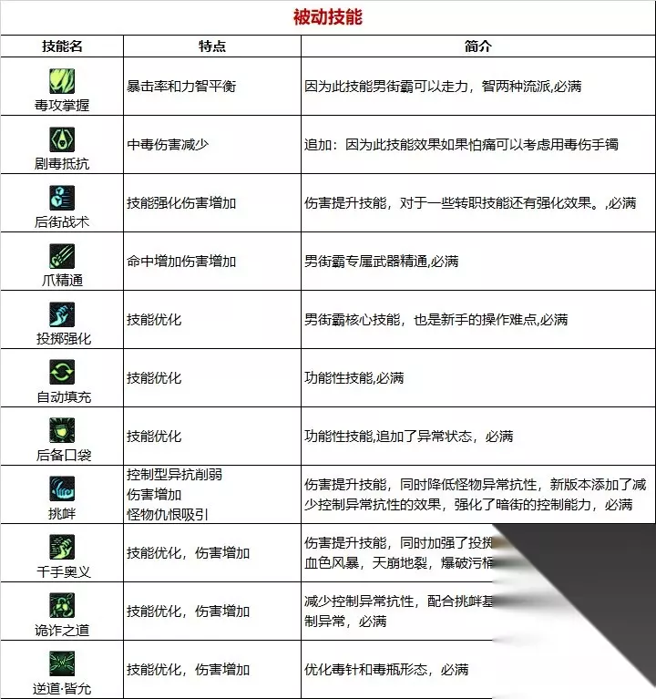 职业优劣势分析: 【优点】 自带大量异常赋予,不太需要考虑异常的触发问题,对[出血伤害]和无色冰晶等装备有极高的相性,算是版本红利 【缺点】 投掷和异常数量增伤机制导致输出节奏需要适应和上手 【大神点评】 自带4种伤害异常,能够比较轻松的吃到特殊自定义的异常技攻。 拥有全职业最高的出血占比,是出血体系收益最大的职业。 装备相性: 男街霸和出血手镯相性非常好,技能自带的出血能吃到出血伤害增加词条的加成同时也能吃到出血层数带来的伤害增加,出血手镯在有伤害优势的同时还能辅助我们叠出血层数,使自带出血的技能达到更高的伤害。 自带4种伤害异常,不需要刻意用一些严重亏模的装备触发异常。 霸王拳不吃恩特裤子的加Cddebuff,可以用恩特裤子来特化伏虎。 出血手镯、猎食肩(感电中毒)、猎食腰带(出血灼烧)可以辅助男街霸叠异常,在长线作战中能够直接省去叠异常这个操作。 入坑建议: ①针对搬砖刮痧(大天御玩家): 其他职业常规搭配基本都差不多,暗街也可以考虑石化出血流 ②针对中配自强(巴卡妮回廊单刷玩家): 中等投资强烈建议玩特化霸王拳,无色冰晶即可启动,同时只建议出血流,但上衣的话蓝灵没有3词条建议先别用 ③针对团本扛把子(红10甚至更高打造玩家): 暗街对于出血伤害词条相性很好,搭配蓝灵,恩特裤子戒指等也有不错的发挥,高打造下就是嗯加自定义就完事了 技能加点和护石 1.常见玩法心得 上buff(投掷强化),吃药(注意抗性是否能稳定触发恩特左槽的15出血) 擒月炎、伏虎、二觉需要3层异常才能达到最大伤害,需要时刻维持目标的异常状态,建议毒雷、毒瓶起手。 四投中,针为了输出建议强化,毒瓶为了叠异常不建议强化,网为了减少后摇绝对不强化,石头不建议点。 在连招的时候要有意识的用强化毒针、桶揉掉技能后摇,但要抓准强化时机,否则技能会被揉没。 肘击、瞬步是很好用的短cd位移技能,配合伏虎的无敌男街霸可以有不错的输出环境。 挑衅的增伤是被动效果,无需释放即可享受加成,主动释放可以降低目标命中率,变相提高自身生存能力。 2.加点 110版本暗街的SP和TP较为富裕,可以多满一个大技能,基本就是千锁和血色中抉择(2选1),如果你走出血流那么就选血色,如果你走直伤且希望演出快点那么还是千锁,小技能的话7月毒瓶抛沙根据喜好满一个,主要也是根据你的异常装备决定