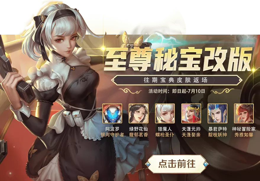 参与至尊夺宝可获得阿波罗-银河守护者、绿野花仙-馥郁茗香、猎魔人-蝶枪圣仆、天蓬元帅-天蓬娶亲、暴君萨特-靛枝妖神、神秘冒险家-秀雅如馨等皮肤!