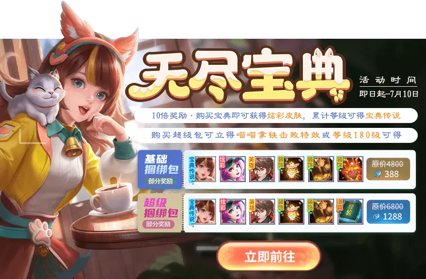 只需388点券即可获得10倍超值返利!现在购买最新的无尽宝典即可获得当期无尽宝典传说皮肤精卫-喵喵拿铁、炫彩皮神秘冒险家-晨彩探寻者。