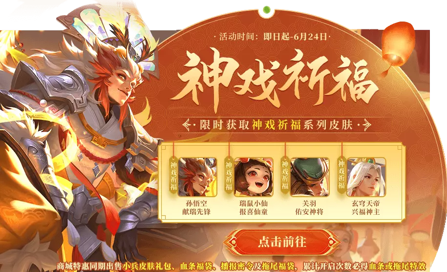 神戏祈福套系皮肤兑换活动开启!通过每日登录礼包获得兑换币到达一定数量即可兑换孙悟空-献瑞先锋、瑞鼠小仙-报喜仙童、关羽-佑安神将、玄穹天帝-兴福神主!