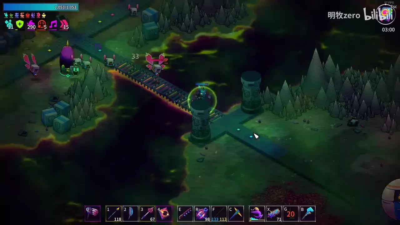 这里得讲一下易燃物质是范围内有多少个怪,命中多少个脚底下就会生成多少个火圈,实际上非常暴力,可以搭配锤头蝠当炮灰,分裂4个小锤头蝠然后聚在一起喷一下,配合上述buff给的火焰能一下做到1000*4的火焰伤害。只要蚂蚁够多,一把火直接烧死D导不是问题